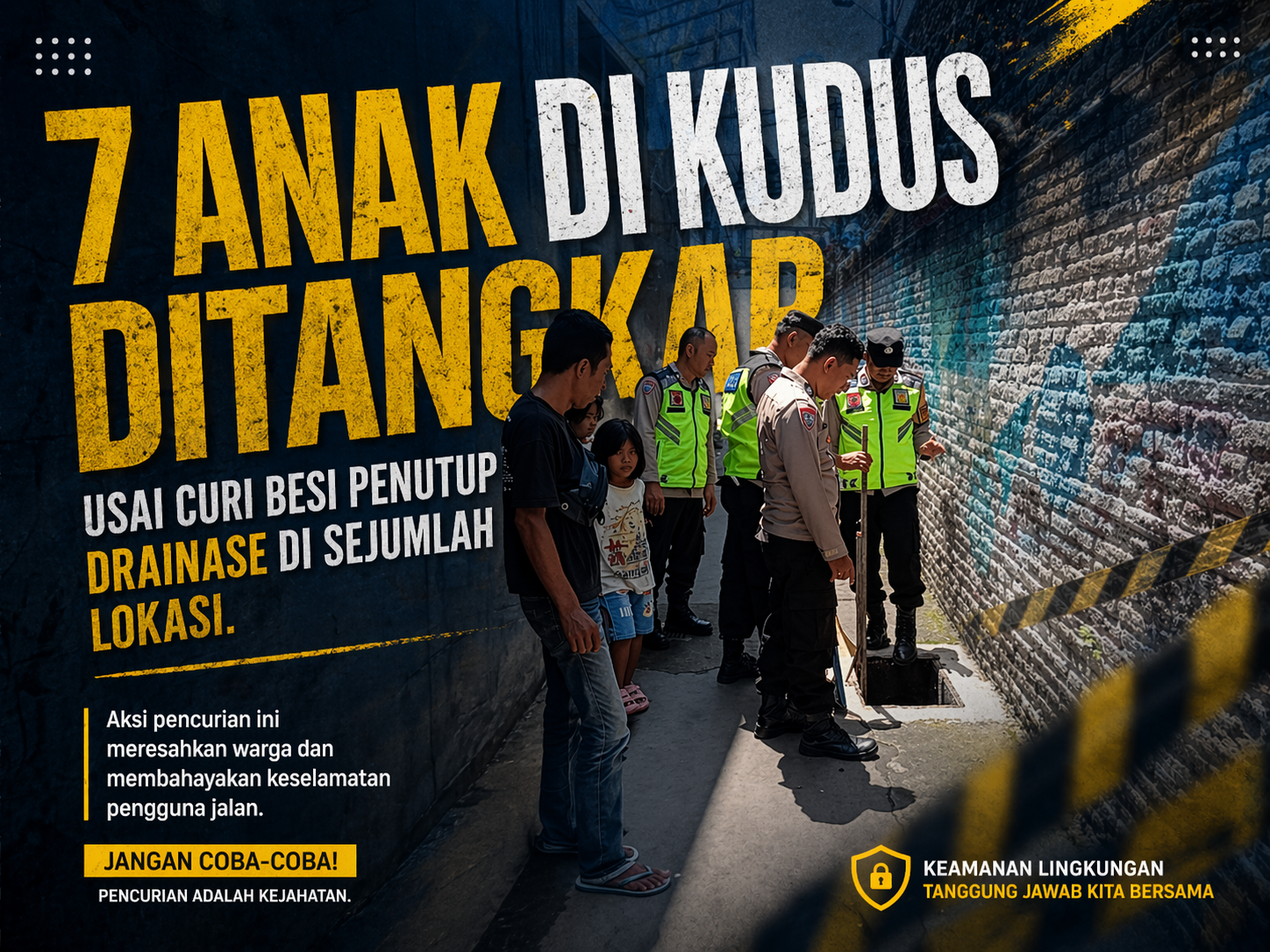 Kudus – Polisi mengungkap kasus pencurian besi penutup saluran air atau drainase di sejumlah wilayah Kabupaten Kudus, Jawa Tengah. Mengejutkannya, tujuh pelaku merupakan anak-anak.
