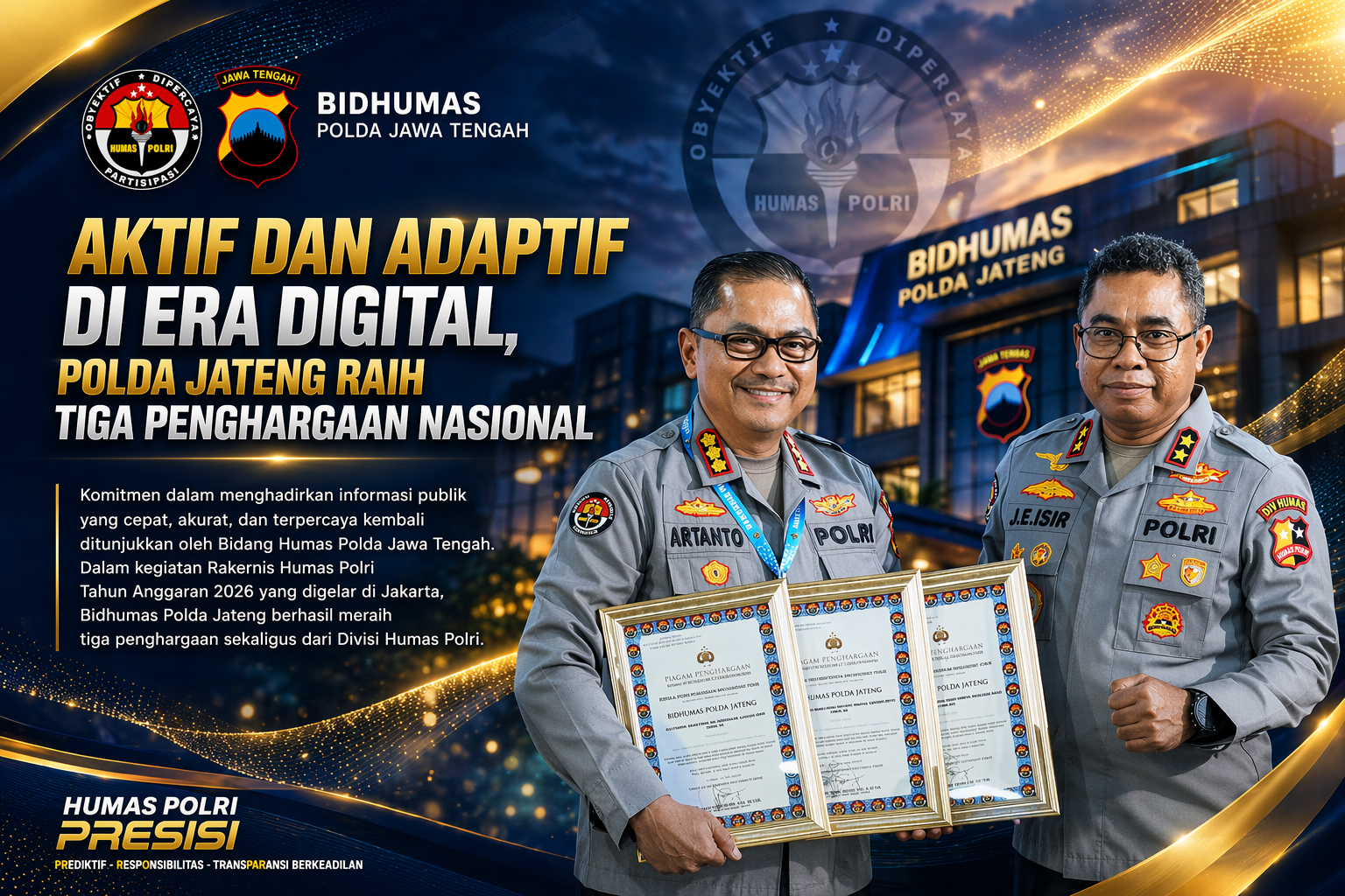 Kota Semarang | Komitmen dalam menghadirkan informasi publik yang cepat, akurat, dan terpercaya kembali ditunjukkan oleh Bidang Humas Polda Jawa Tengah. Dalam kegiatan Rakernis Humas Polri Tahun Anggaran 2026 yang digelar di Jakarta, Bidhumas Polda Jateng berhasil meraih tiga penghargaan sekaligus dari Divisi Humas Polri.
