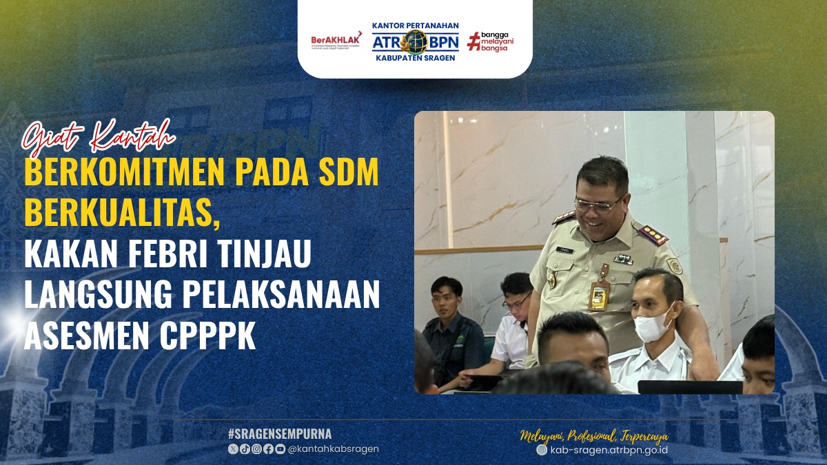 Sragen — Komitmen dalam menciptakan birokrasi yang profesional dan transparan ditunjukkan oleh Kepala Kantor Pertanahan Kabupaten Sragen, Febri Effendi, S.SiT., M.M., yang turun langsung meninjau pelaksanaan asesmen Calon Pegawai Pemerintah dengan Perjanjian Kerja (CPPPK) pada Selasa (29/07). Kegiatan ini berlangsung di Aula Pangeran Samudra dan diikuti oleh 48 peserta.