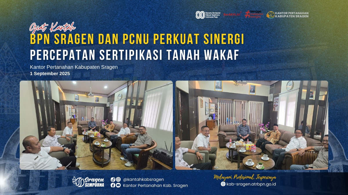 Pertemuan yang berlangsung di Kantor Pertanahan Kabupaten Sragen ini membahas tindak lanjut program Iktikaf Ibadah Percepatan Sertipikasi Wakaf, sebuah upaya strategis untuk memberikan kepastian hukum atas aset wakaf di wilayah Sragen. Program ini merupakan implementasi dari Nota Kesepahaman (MoU) antara Kementerian ATR/BPN dengan Kementerian Agama.