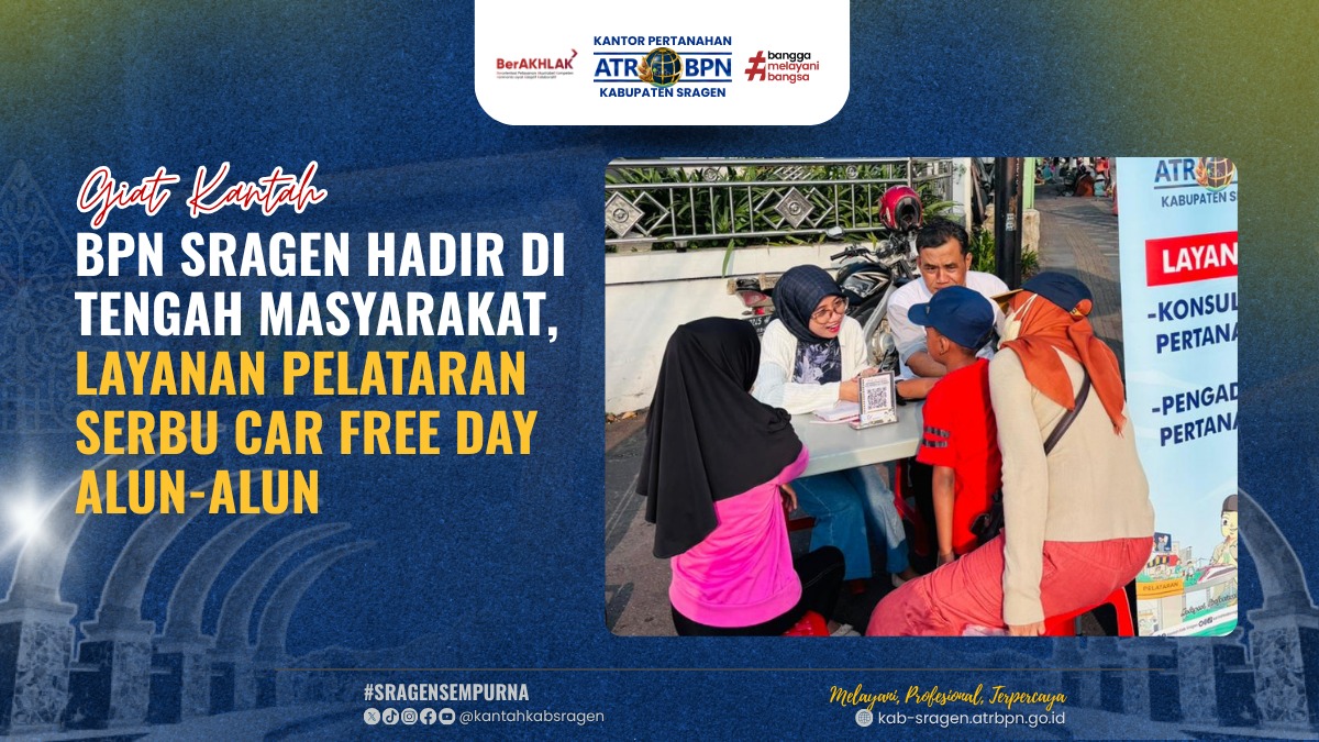 Kehadiran gerai PELATARAN ini merupakan bagian dari upaya Kantor Pertanahan Kabupaten Sragen dalam menghadirkan pelayanan yang responsif, terbuka, dan mudah dijangkau. Melalui pendekatan jemput bola ini, diharapkan kesadaran hukum pertanahan semakin meningkat dan kepercayaan masyarakat terhadap pelayanan pertanahan terus terbangun.
