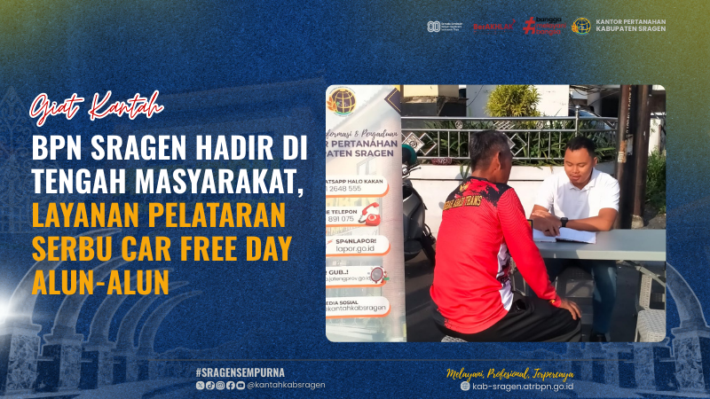 Kehadiran gerai PELATARAN ini merupakan bagian dari upaya Kantor Pertanahan Kabupaten Sragen dalam menghadirkan pelayanan yang responsif, terbuka, dan mudah dijangkau. Melalui pendekatan jemput bola ini, diharapkan kesadaran hukum pertanahan semakin meningkat dan kepercayaan masyarakat terhadap pelayanan pertanahan terus terbangun.
