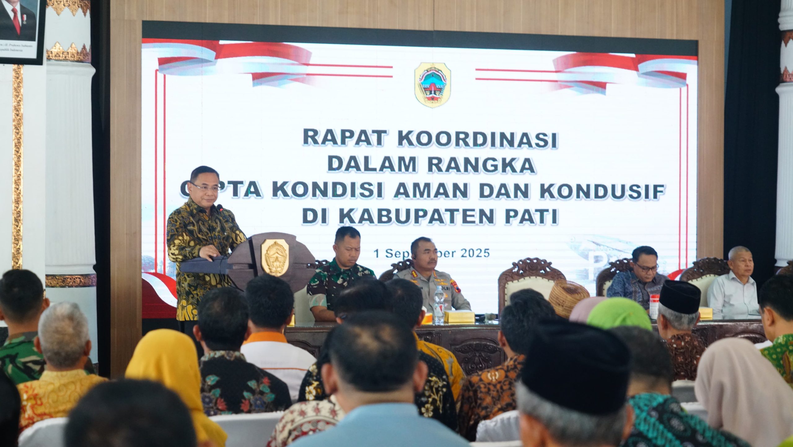 PATI, 1 September 2025 — Bupati Pati, Sudewo, hadir pada Rapat Koordinasi (Rakor) dalam rangka Cipta Kondisi Aman dan Kondusif di Kabupaten Pati. Acara yang berlangsung di Pendopo Kabupaten Pati ini juga dihadiri oleh Wakil Bupati Pati, DPRD Kabupaten Pati, Forkopimda, Pj Sekda, para kepala OPD, camat, kepala sekolah SMP hingga SMA/SMK negeri dan swasta, KCD Pendidikan Wilayah III Jawa Tengah, serta tamu undangan lainnya.