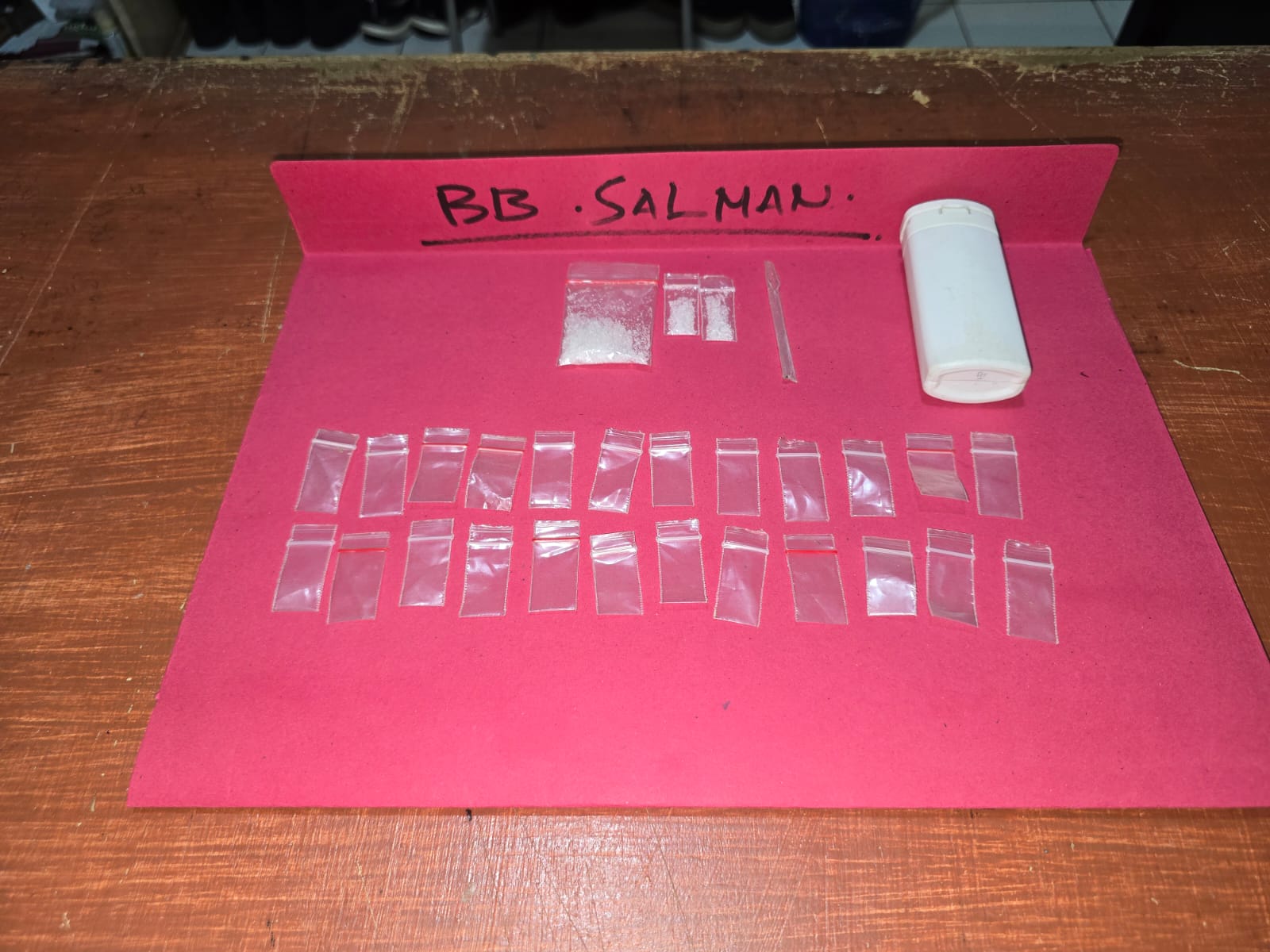 Dari hasil penggeledahan, ditemukan barang bukti berupa satu paket sabu ukuran sedang dan dua paket kecil dengan total berat kotor 2,46 gram. Selain itu, turut diamankan 24 plastik bening, pipet sendok, botol plastik, satu unit handphone, uang tunai Rp500.000 yang diduga hasil transaksi, serta celana yang digunakan pelaku untuk menyimpan barang haram tersebut.