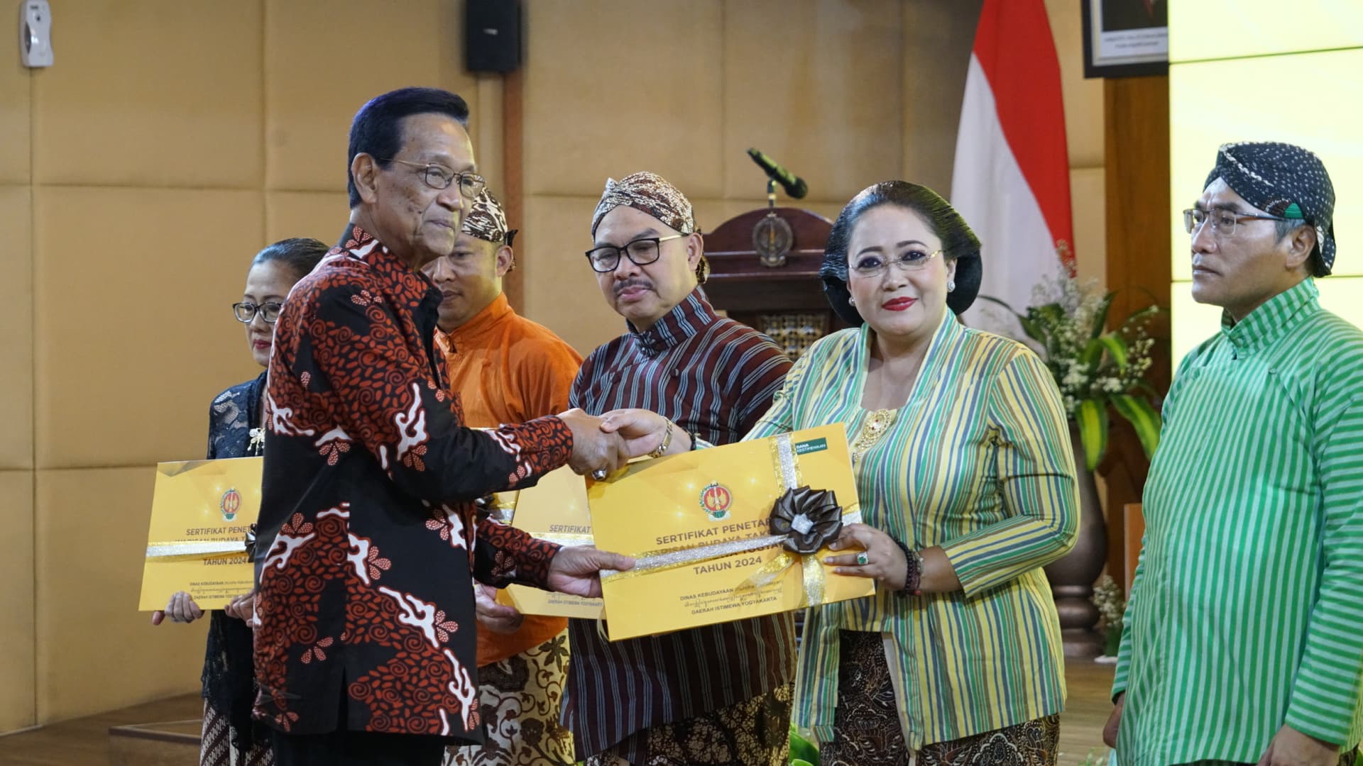 Sertifikat penghargaan itu diberikan Gubernur DIY, Sri Sultan Hamengkubuwono X di Gedhong Pracimasan, Komplek Kepatihan Kantor Gubernur DIY, Yogyakarta, Selasa, (26/05/2025).Kepada Bupati Gunungkidul Endah Subekti Kuntariningsih.
