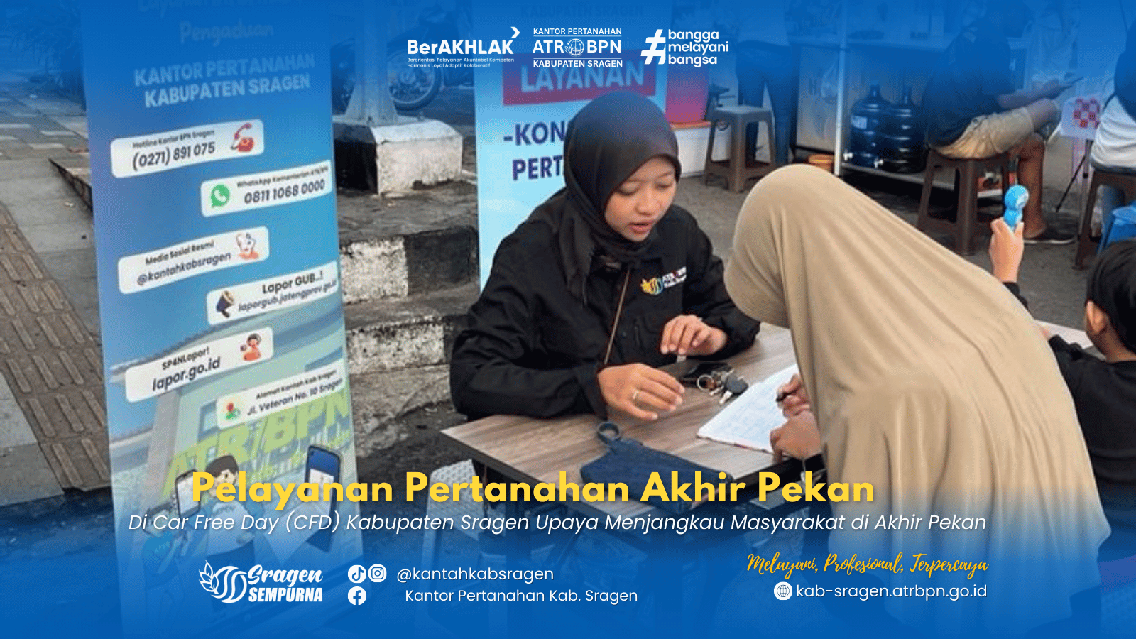 Kantor Pertanahan Kabupaten Sragen terus berinovasi dalam meningkatkan kualitas pelayanan dengan mengedepankan prinsip mudah, cepat, dan transparan. Melalui layanan jemput bola di tengah aktivitas masyarakat, diharapkan semakin banyak warga yang terbantu dalam menyelesaikan kebutuhan pertanahan secara tepat dan sesuai ketentuan.