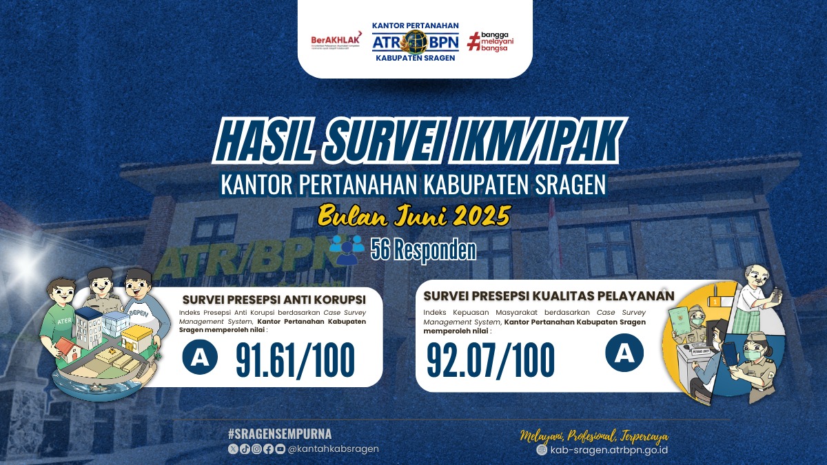 Sragen — Kantor Pertanahan Kabupaten Sragen kembali menunjukkan komitmennya dalam memberikan pelayanan terbaik kepada masyarakat. Berdasarkan hasil Survei Indeks Kepuasan Masyarakat (IKM) dan Indeks Persepsi Anti Korupsi (IPAK) pada bulan Juni 2025, Kantor Pertanahan Kabupaten Sragen berhasil meraih predikat A untuk kedua kategori.