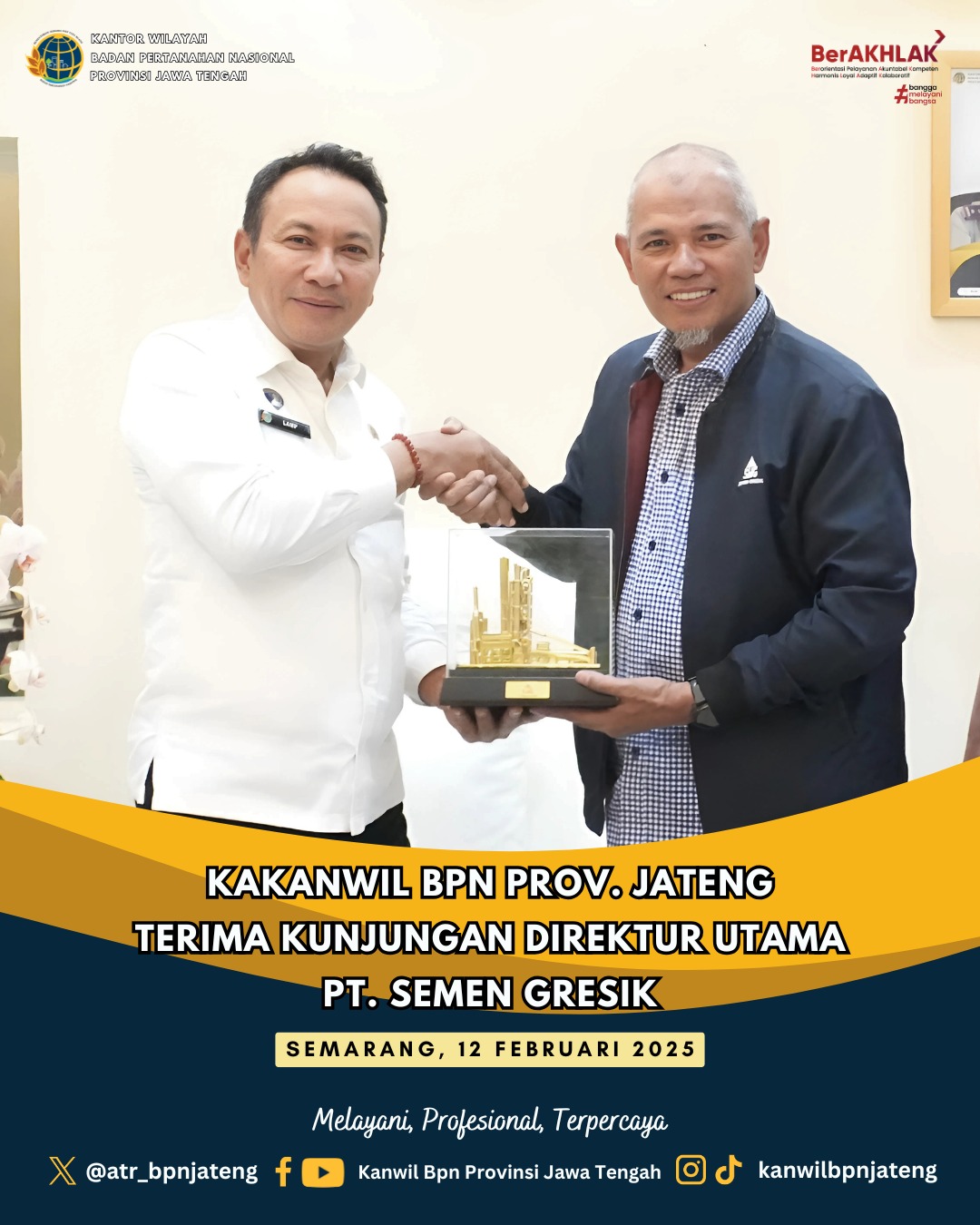 Kepala Kantor Wilayah BPN Provinsi Jawa Tengah, Lampri menerima kunjungan dari Direktur Utama PT. Semen Gresik Pabrik Rembang, M. Supriyadi pada Rabu (12/02/2025)