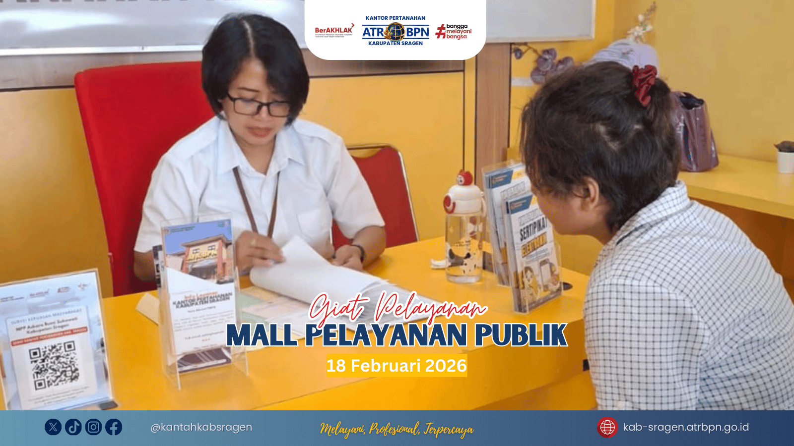 Sragen – Rabu, 18 Februari 2026. Dalam rangka mendekatkan layanan kepada masyarakat serta meningkatkan kemudahan akses pelayanan pertanahan, Kantor Pertanahan Kabupaten Sragen kembali hadir memberikan layanan langsung di Mall Pelayanan Publik Kabupaten Sragen. Kehadiran ini menjadi bagian dari komitmen berkelanjutan untuk menghadirkan pelayanan yang cepat, mudah, transparan, dan nyaman bagi seluruh lapisan masyarakat.