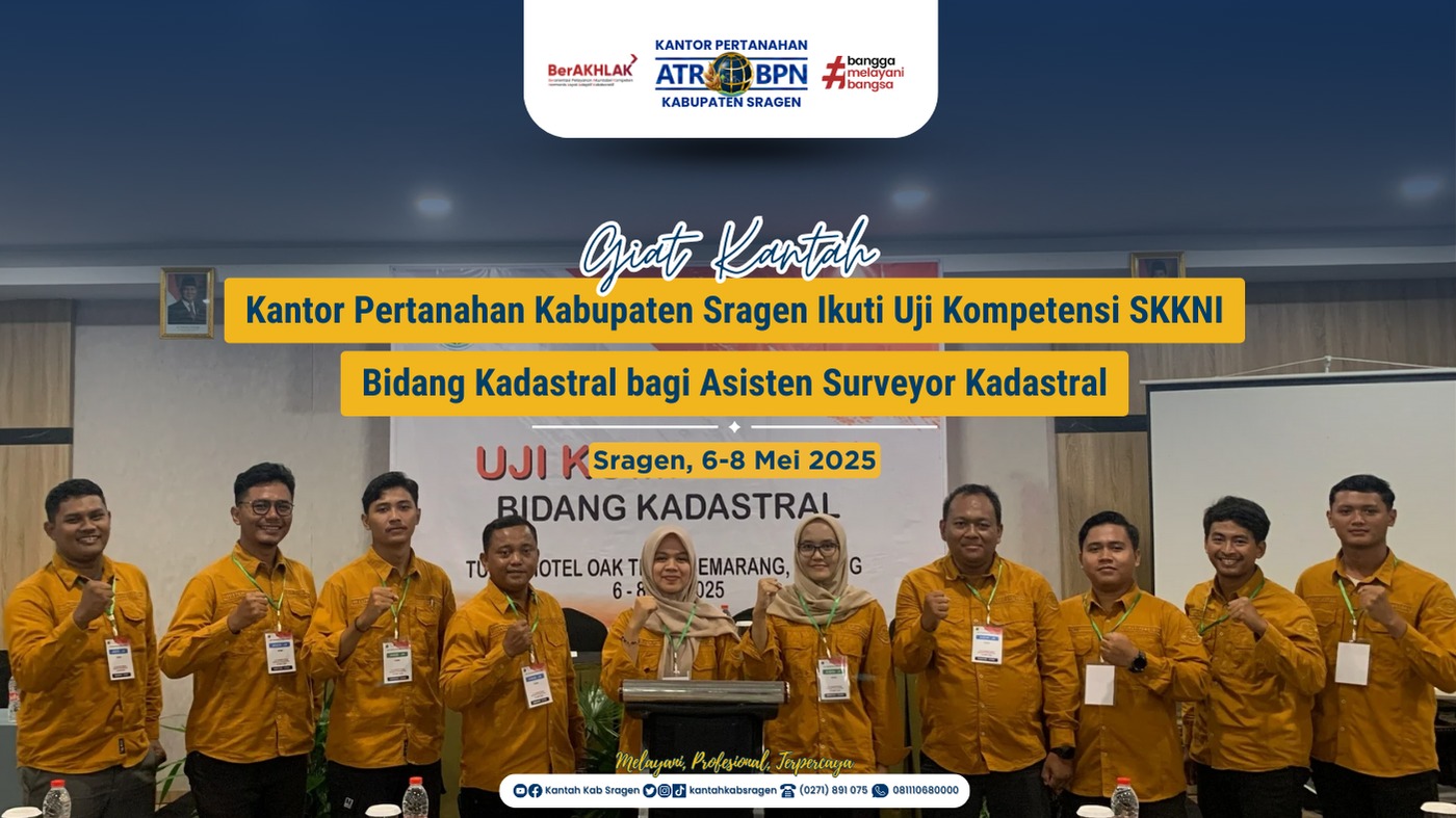 Sragen – Dalam upaya meningkatkan kualitas pelayanan dan keahlian di bidang pertanahan, sejumlah Asisten Surveyor Kadastral (ASK) dari Kantah Sragen mengikuti uji kompetensi bidang kadastral di Semarang. Kegiatan ini diselenggarakan oleh Masyarakat Ahli Survey Kadastral Indonesia (MASKI) dan akan disertifikasi oleh Lembaga Sertifikasi Profesi Kadaster Indonesia sebagai bentuk komitmen terhadap peningkatan kapasitas sumber daya manusia di sektor pertanahan.