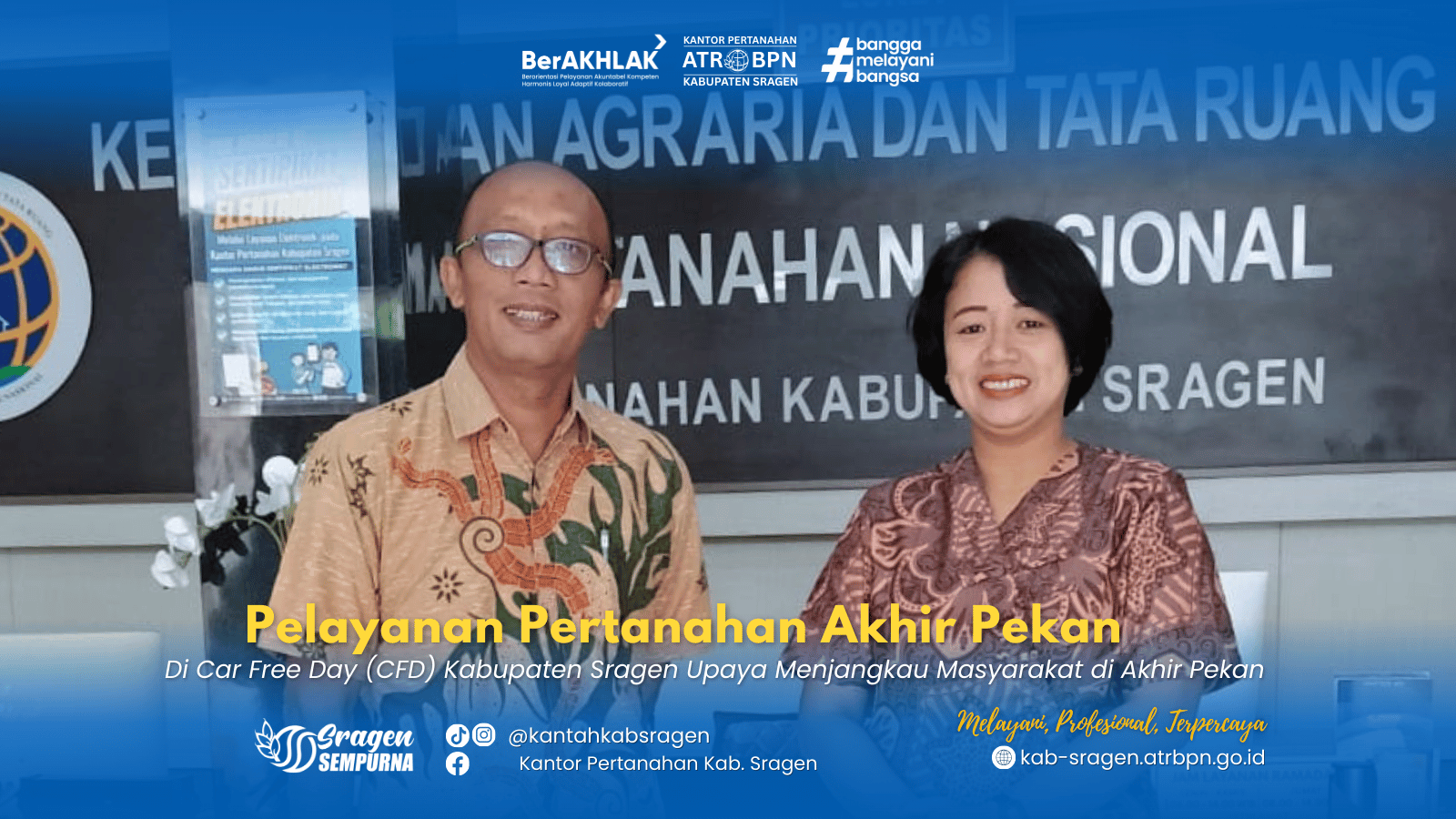 Dengan semangat melayani sepenuh hati, Kantor Pertanahan Kabupaten Sragen bertekad untuk senantiasa hadir di tengah masyarakat, memberikan solusi atas setiap kebutuhan layanan pertanahan, serta memperkuat kepercayaan publik terhadap pelayanan pertanahan di Kabupaten Sragen.