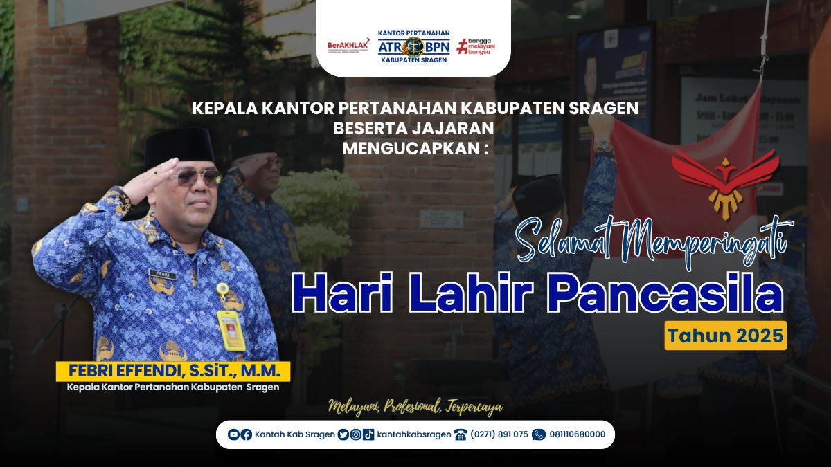 Ucapan dan penghormatan ini sekaligus menjadi bagian dari rangkaian kegiatan Kantor Pertanahan Sragen dalam menyambut upacara resmi yang digelar pada 2 Juni 2025, sesuai surat edaran terbaru dari Kementerian ATR/BPN dan BPIP.