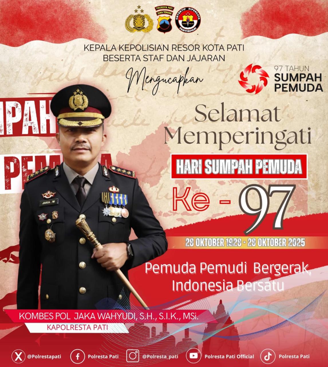 Dengan peringati hari Sumpah Pemuda 28 Oktober 2025 ini, Kapolresta Pati 𝗞𝗼𝗺𝗯𝗲𝘀 𝗣𝗼𝗹 𝗝𝗮𝗸𝗮 𝗪𝗮𝗵𝘆𝘂𝗱𝗶, 𝗦.𝗛., 𝗦.𝗜.𝗞., 𝗠.𝗦𝗶. beserta staf dan jajaran mengucapkan “𝗦𝗲𝗹𝗮𝗺𝗮𝘁 𝗺𝗲𝗺𝗽𝗲𝗿𝗶𝗻𝗴𝗮𝘁𝗶 𝗛𝗮𝗿𝗶 𝗦𝘂𝗺𝗽𝗮𝗵 𝗣𝗲𝗺𝘂𝗱𝗮 𝗸𝗲 𝟵𝟳 𝘁𝗮𝗵𝘂𝗻 𝟮𝟬𝟮𝟱”. Terus kobarkan semangat untuk mewujudkan Indonesia Emas 2045.