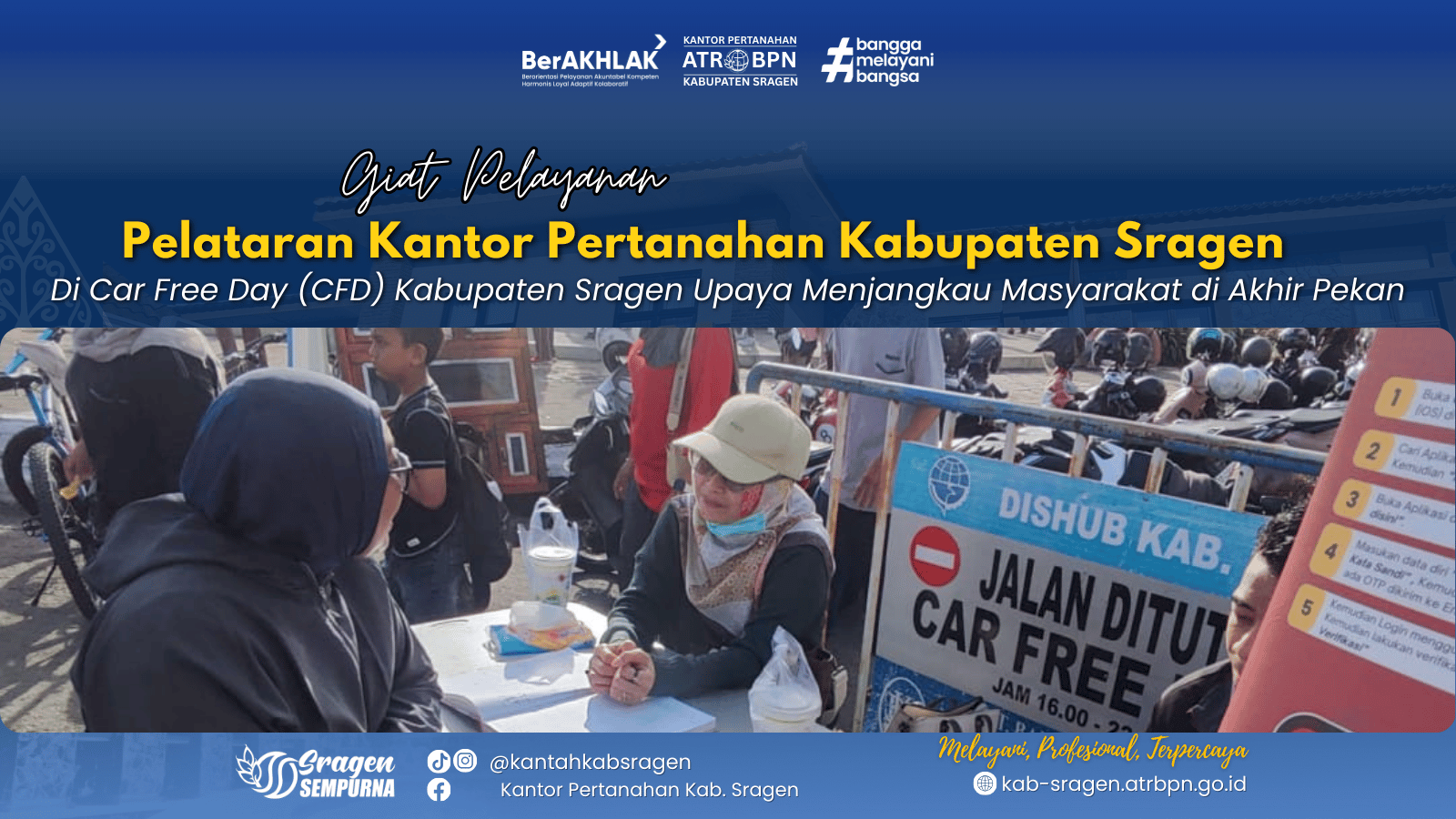 Sragen – Minggu, 28 Desember 2025, Kantor Pertanahan Kabupaten Sragen kembali menghadirkan layanan konsultasi pertanahan di tengah kegiatan Car Free Day (CFD) yang berlangsung di pusat keramaian masyarakat. Kegiatan ini dilaksanakan sebagai bentuk komitmen untuk mendekatkan pelayanan pertanahan kepada masyarakat secara langsung, sekaligus memanfaatkan momentum CFD yang menjadi ruang interaksi publik.