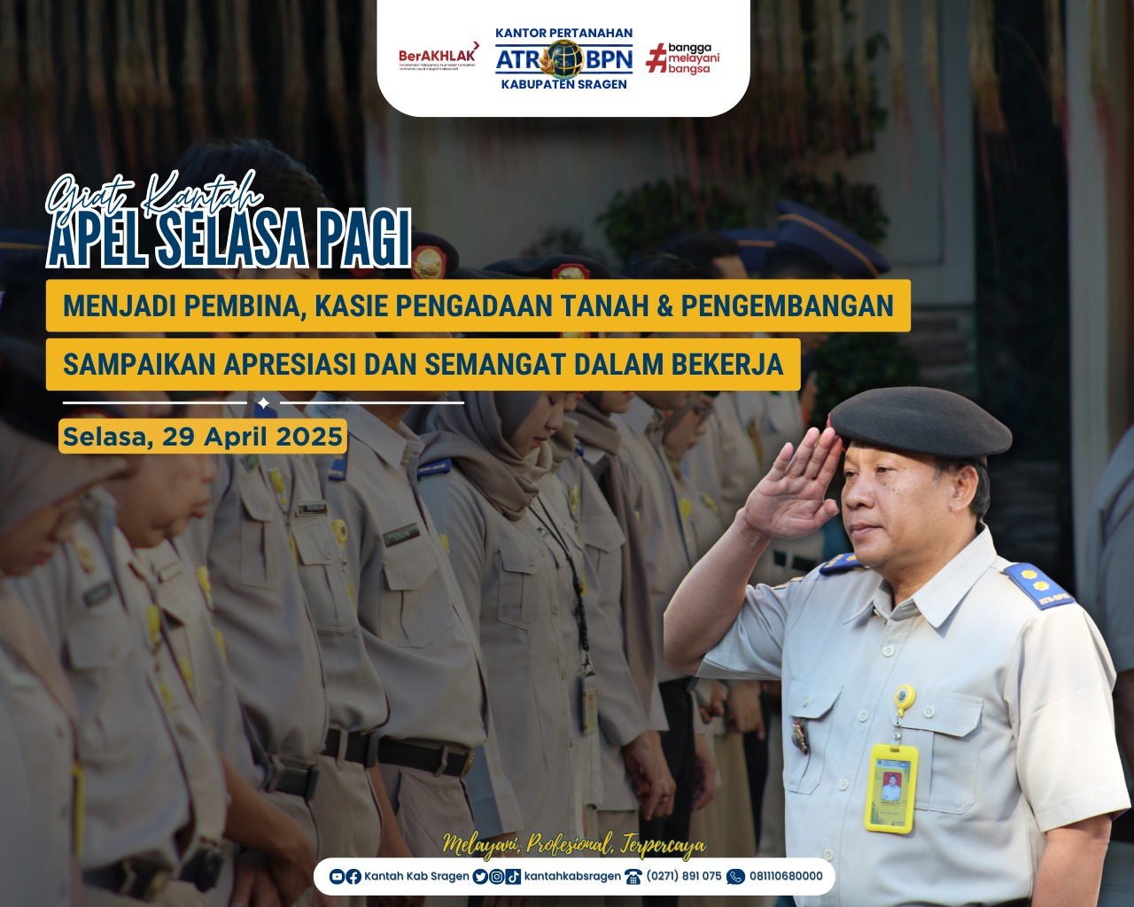 Sragen – Kantor Pertanahan Kabupaten Sragen menggelar apel pagi pada Selasa, 29 April 2025, di halaman kantor setempat. Apel ini diikuti oleh seluruh pegawai dengan penuh semangat dan disiplin.