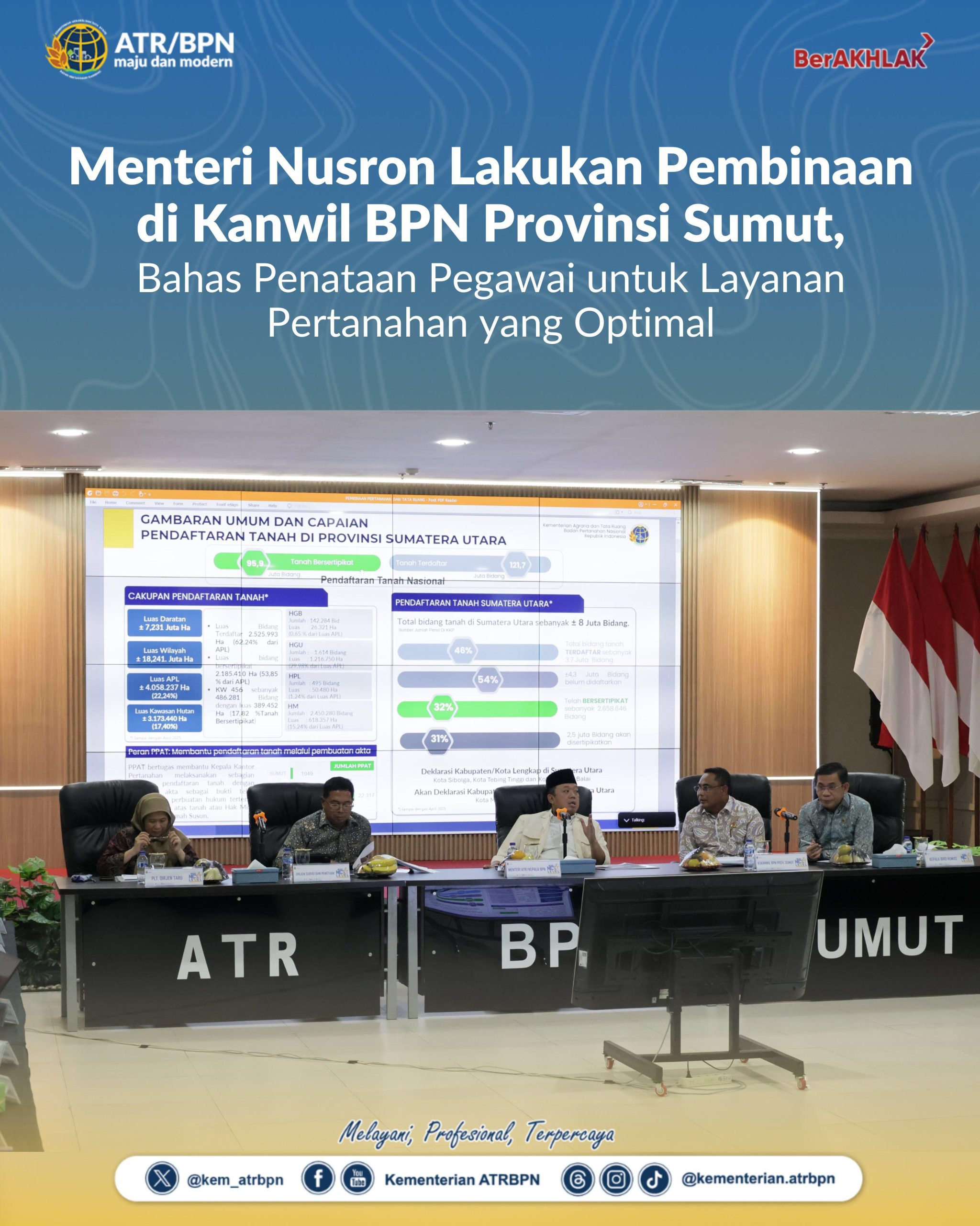 Medan – Menteri Agraria dan Tata Ruang/Kepala Badan Pertanahan Nasional (ATR/BPN), Nusron Wahid, berkunjung ke Kantor Wilayah (Kanwil) BPN Provinsi Sumatera Utara (Sumut) pada Rabu (07/05/2025). Dalam kesempatan ini, ia memberikan pembinaan kepada seluruh Kepala Kantor Pertanahan (Kantah) dan Kepala Subbagian Tata Usaha se-Provinsi Sumut. Salah satu sorotan yang disampaikan ialah terkait penataan pegawai yang akan dilaksanakan Kementerian ATR/BPN.