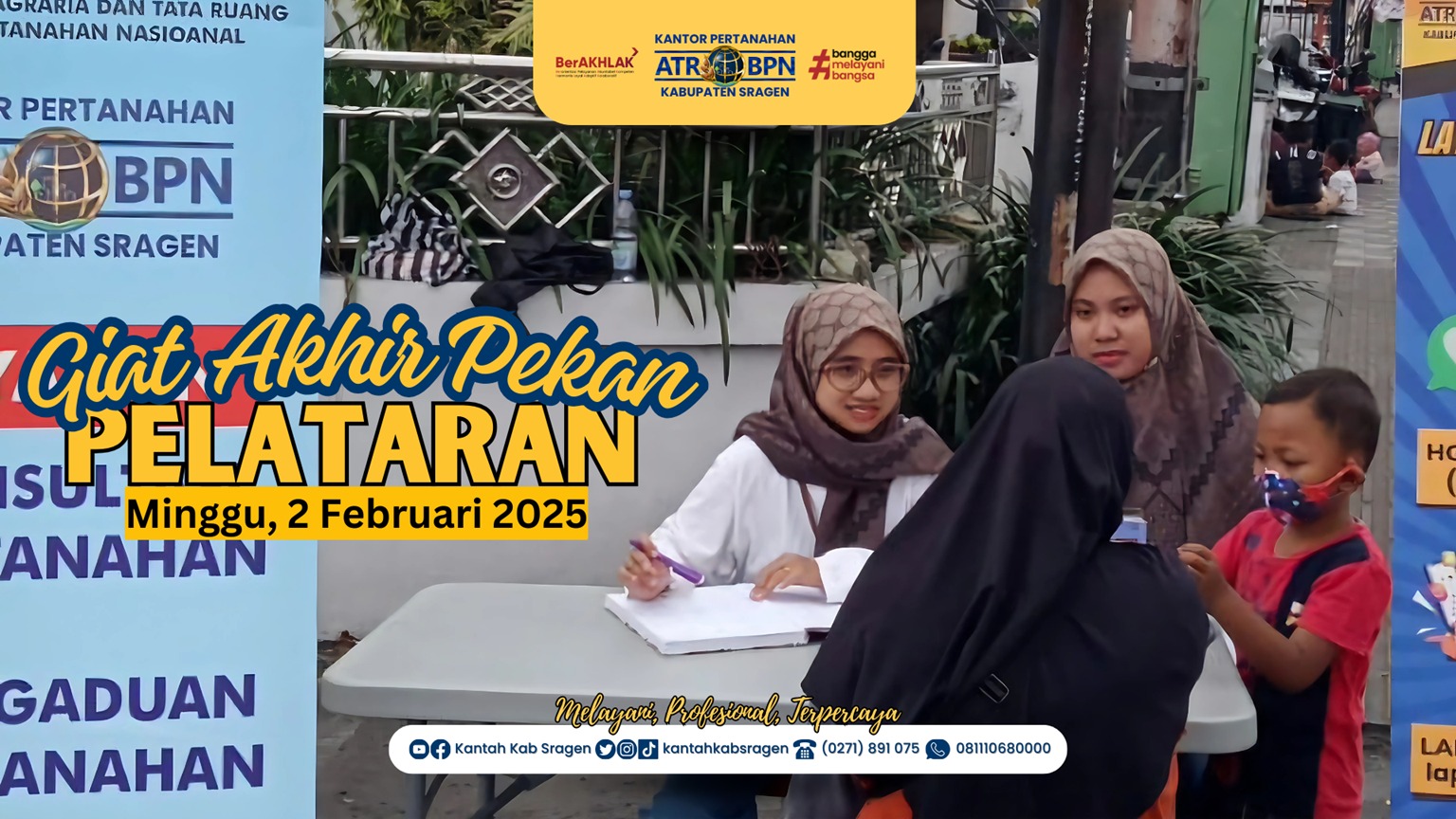 Sragen – Dalam rangka menindaklanjuti Surat Edaran Menteri Agraria dan Tata Ruang/Kepala Badan Pertanahan Nasional Nomor 14/SE-HK.02/VII/2022, Kantor Pertanahan Kabupaten Sragen melaksanakan kegiatan Pelayanan Tanah Akhir Pekan (PELATARAN). Program ini dilaksanakan untuk memberikan kemudahan akses bagi masyarakat yang ingin mengurus layanan pertanahan di luar jam kerja biasa.