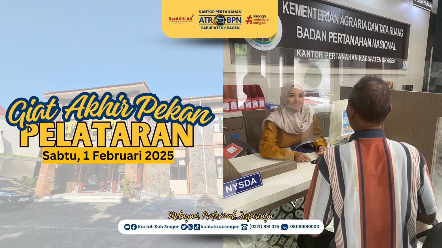 Sragen – Dalam rangka menindaklanjuti Surat Edaran Menteri Agraria dan Tata Ruang/Kepala Badan Pertanahan Nasional Nomor 14/SE-HK.02/VII/2022, Kantor Pertanahan Kabupaten Sragen melaksanakan kegiatan Pelayanan Tanah Akhir Pekan (PELATARAN). Program ini dilaksanakan untuk memberikan kemudahan akses bagi masyarakat yang ingin mengurus layanan pertanahan di luar jam kerja biasa.