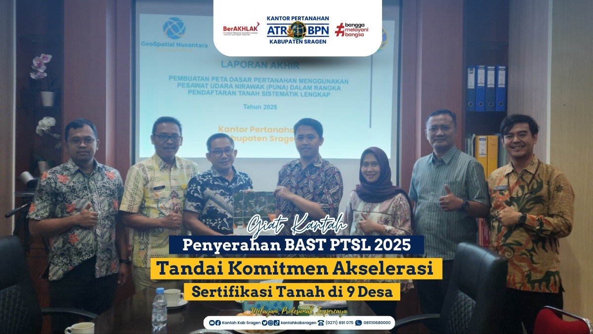 Sragen – Program Pendaftaran Tanah Sistematis Lengkap (PTSL) 2025 di Kabupaten Sragen kembali menunjukkan progres nyata. Pada Kamis (08/05), PT Geospatial Nusantara selaku penyedia jasa pengukuran resmi menyerahkan dokumen Berita Acara Serah Terima (BAST) kepada Kantor Pertanahan Kabupaten Sragen. Penyerahan ini menandai selesainya tahap kegiatan pemotretan foto udara di 9 (sembilan) desa yang ada di Kabupaten Sragen dan akan dilanjutkan kegiatan pengukuran dan pemetaan dalam rangka penyelesaian program PTSL tahun 2025.