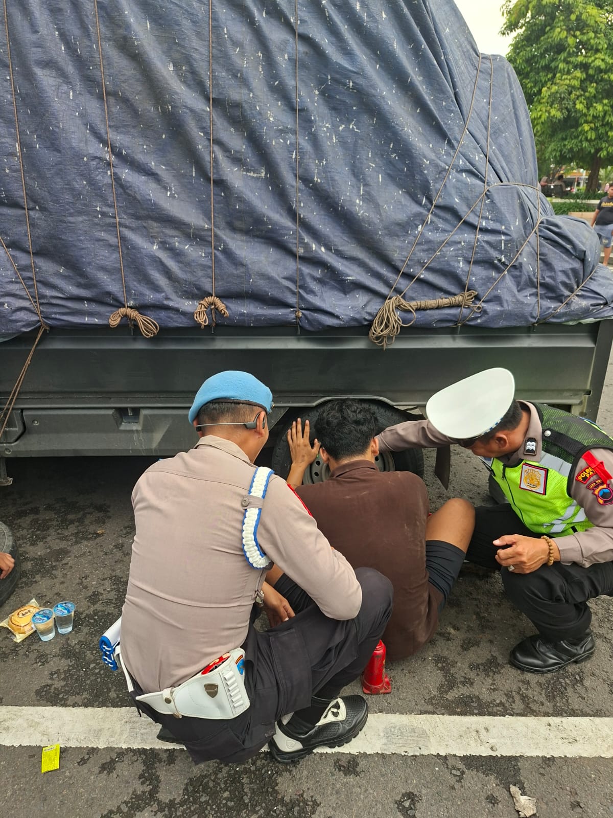 Peristiwa tersebut terjadi sekitar pukul 08.30 WIB saat arus lalu lintas di kawasan pusat kota Pati terpantau cukup padat. Melihat adanya kendaraan yang berhenti mendadak di badan jalan, petugas Pospam Terpadu langsung bergerak cepat melakukan pengaturan lalu lintas sekaligus membantu pengendara agar proses evakuasi berjalan aman dan tidak menimbulkan kemacetan.