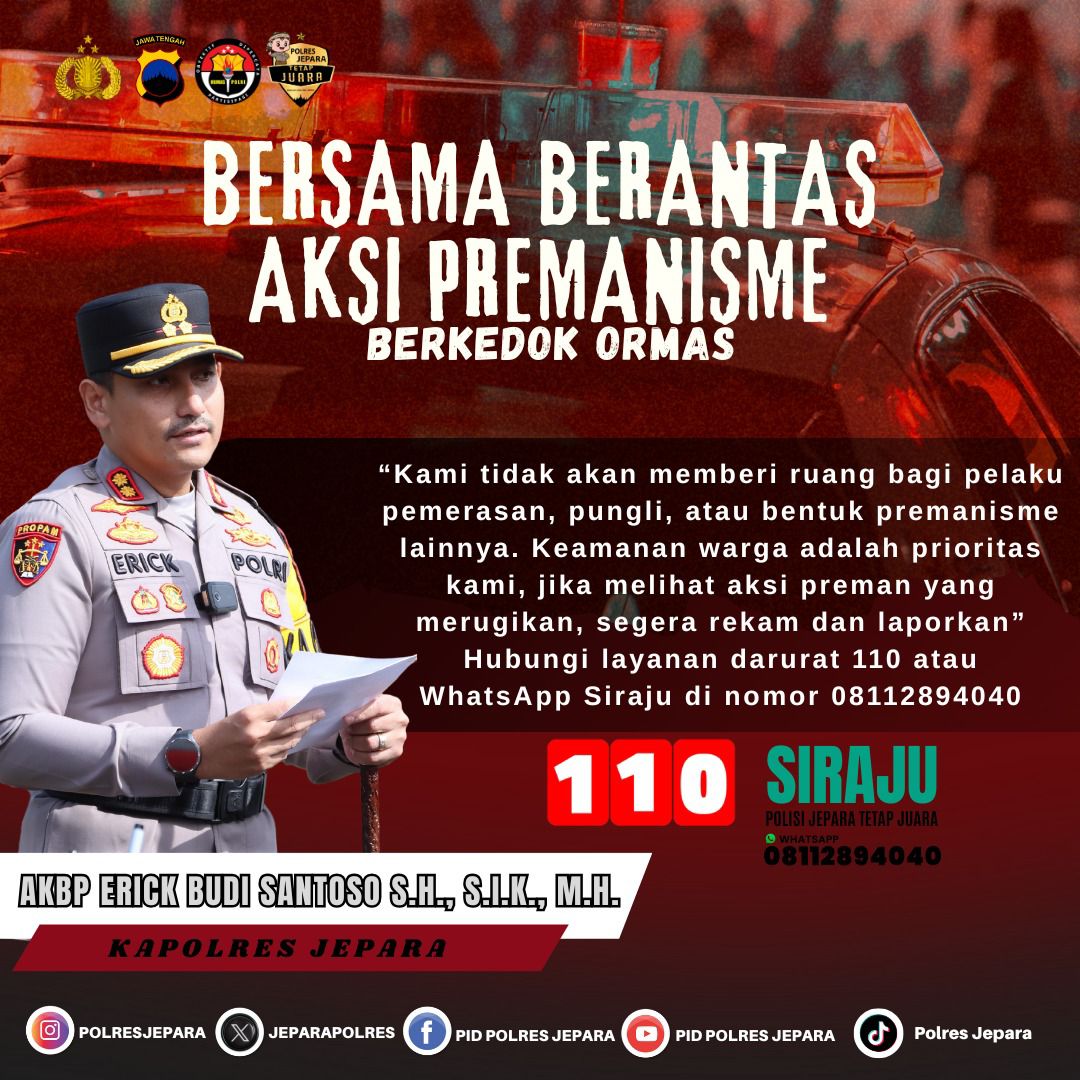 Jepara – Jawa Tengah| Kepolisian Resor (Polres) Jepara, Polda Jawa Tengah, mengimbau masyarakat untuk tidak takut dan ragu untuk melaporkan apabila melihat atau mengalami tindak premanisme. Pelaporan dapat dilakukan secara langsung ke kantor kepolisian terdekat atau melalui Call Center 110 yang siap melayani 24 jam secara gratis atau WhatsApp Siraju di nomor 08112894040.