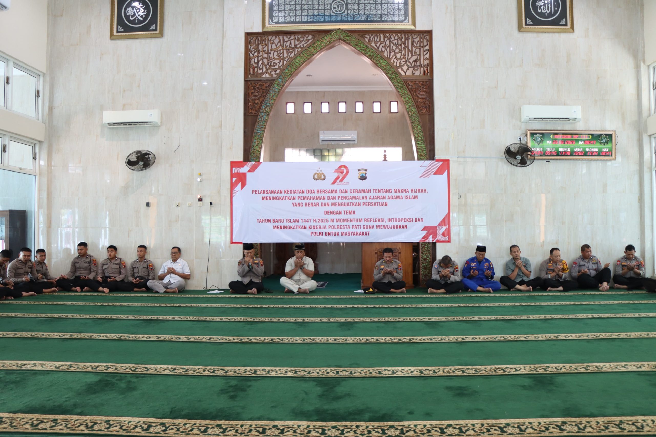 Pati, Jawa Tengah – Menyambut Tahun Baru Islam 1447 Hijriah, Polresta Pati melalui Bagian Sumber Daya Manusia (Bag SDM) menggelar kegiatan Doa Bersama dan Ceramah Keagamaan bertema “Momentum Refleksi, Introspeksi, dan Meningkatkan Kinerja Polresta Guna Mewujudkan Polri untuk Masyarakat”, Kamis (26/6/2025) pagi, di Masjid Al-Ikhlas Polresta Pati.