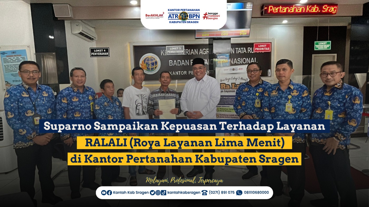 “Terima kasih kami ucapkan kepada Bapak Kepala Kantor BPN Sragen atas proses pendaftaran roya yang mudah dan cepat ini,” ujar Suparno penuh semangat.