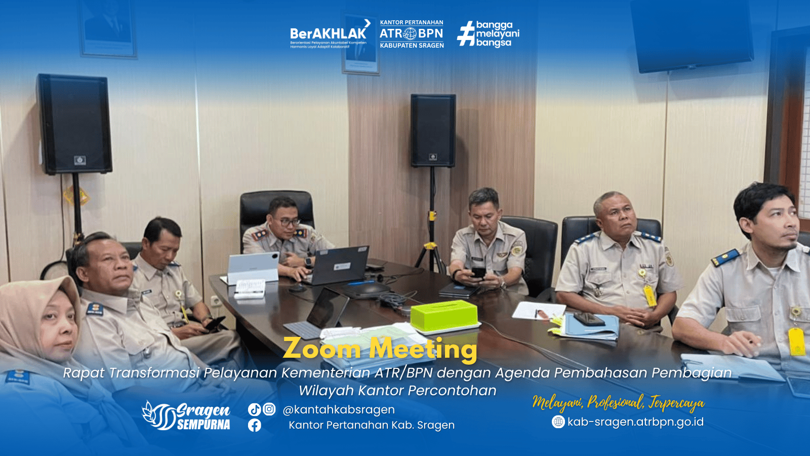 Sragen – Senin, 2 Maret 2026, Kantor Pertanahan Kabupaten Sragen mengikuti Zoom Meeting Rapat Transformasi Pelayanan di lingkungan Kementerian Agraria dan Tata Ruang/Badan Pertanahan Nasional dengan agenda utama pembahasan pembagian wilayah kantor percontohan. Kegiatan ini menjadi bagian dari langkah strategis dalam mendorong percepatan transformasi layanan pertanahan yang lebih modern, responsif, dan berorientasi pada kebutuhan masyarakat.