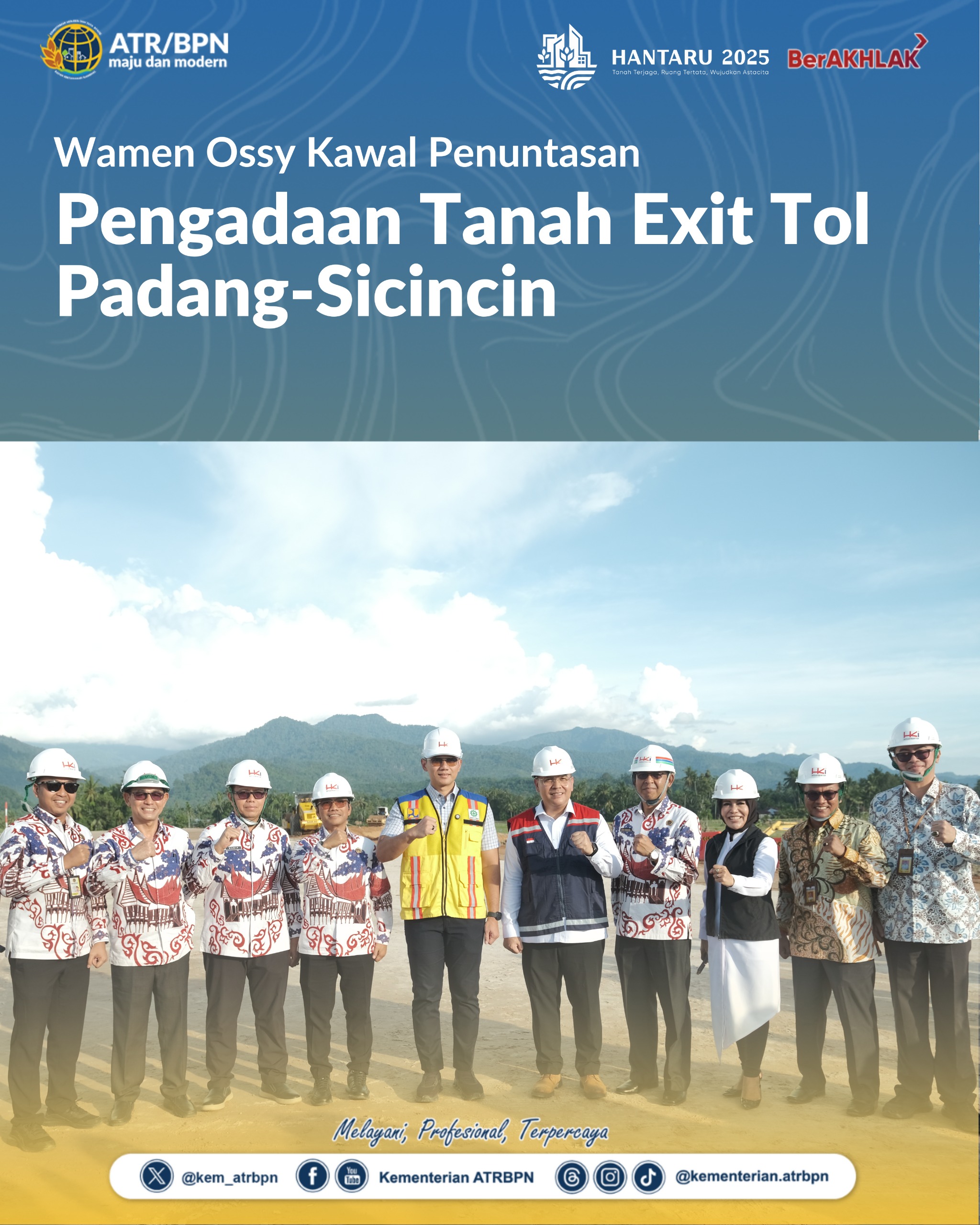 Padang – Kementerian Agraria dan Tata Ruang/Badan Pertanahan Nasional (ATR/BPN) lanjut memproses dokumen bukti kepemilikan masyarakat untuk pengadaan tanah Exit Tol Padang-Sicincin yang terletak di Nagari Lubuk Alung, Kabupaten Padang Pariaman. Hal itu dilakukan agar hasil dari proses pengadaan tanah _prudent_. Hal ini disampaikan oleh Wakil Menteri (Wamen) ATR/Wakil Kepala (Waka) BPN, Ossy Dermawan, saat meninjau Tol Padang-Sicincin, Selasa (30/09/2025).